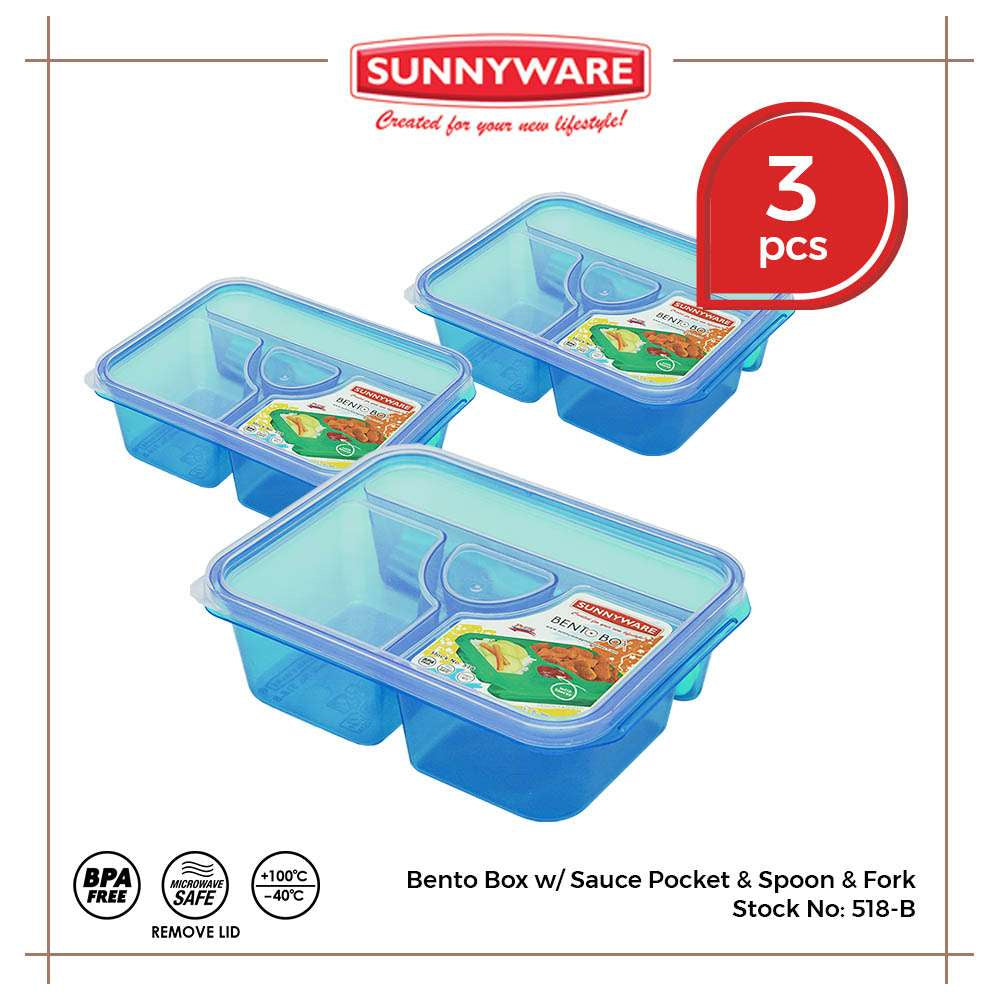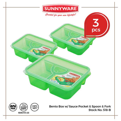 3pcs Big Bento Box w/ Sauce Pocket & Spoon & Fork [Sunnyware 518-B] |Plasticware|Lunch Box |BPA Free